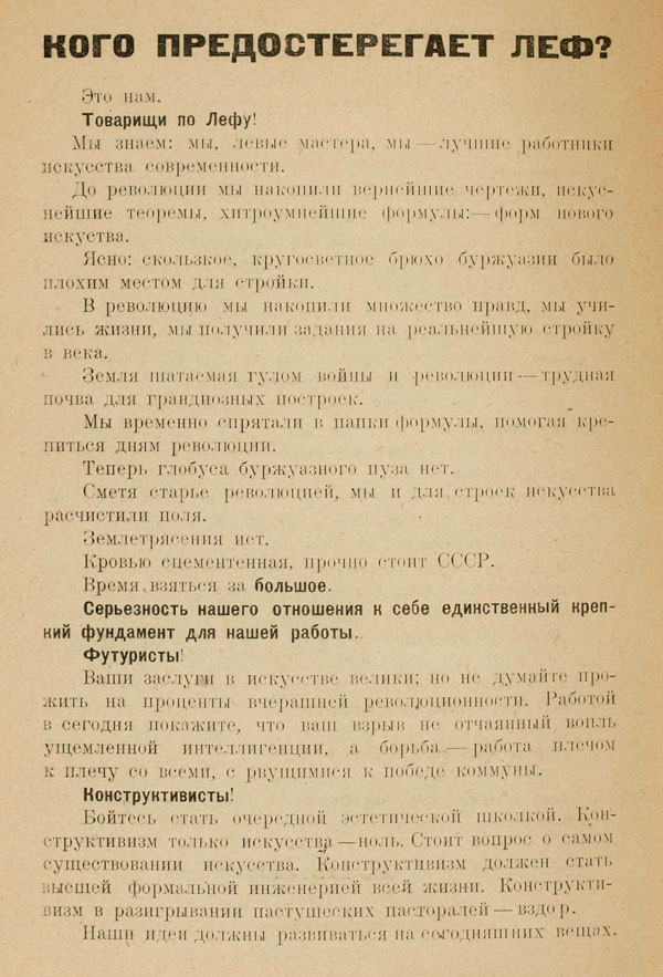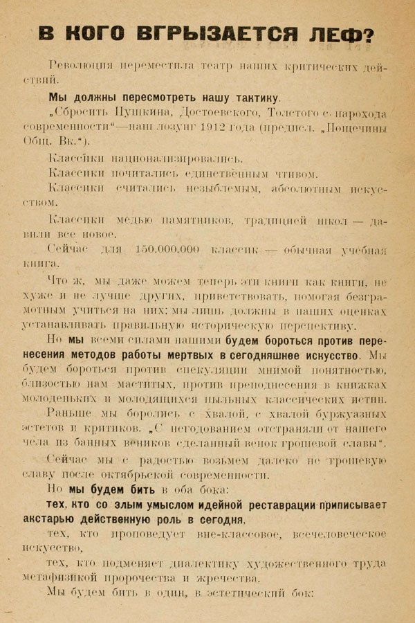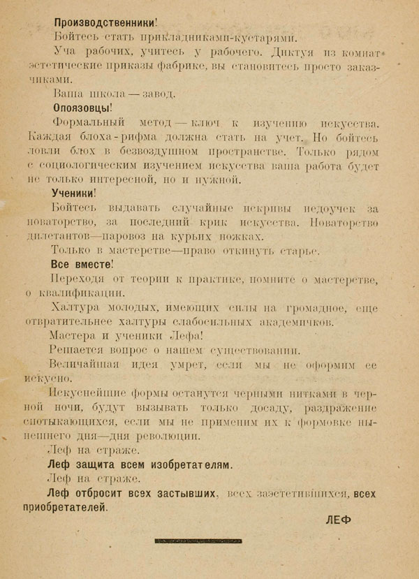 ЛЕФ должен собрать воедино левые силы. ЛЕФ должен осмотреть свои ряды, отбросив прилипшее прошлое. ЛЕФ должен объединить фронт для взрыва старья, для драки за охват новой культуры.